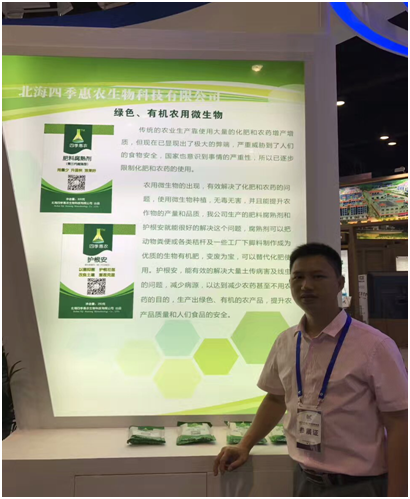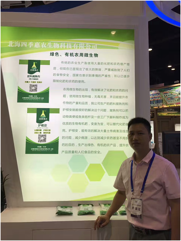 本次展會北海四季惠農生物科技有限公司帶來了兩件它們最新研發的在種植方面有廣泛應用的微生物菌類產品——“肥料腐熟劑”和“護根安”。目前,綠色環保農業是當前的大勢所趨,生物肥料以其獨特的優勢正日益受到社會和研究者們的重視。微生物菌肥可以改善土壤的物理性狀使之松軟、透氣、透水,同事抑制有害微生物繁殖,減少甚至不用花費、農藥,達到生產出真正的綠色食品的目的。四季惠農公司的產品正是能起到這樣的效果,相信其將來對有機農業的發展能夠起到很好的推進作用。